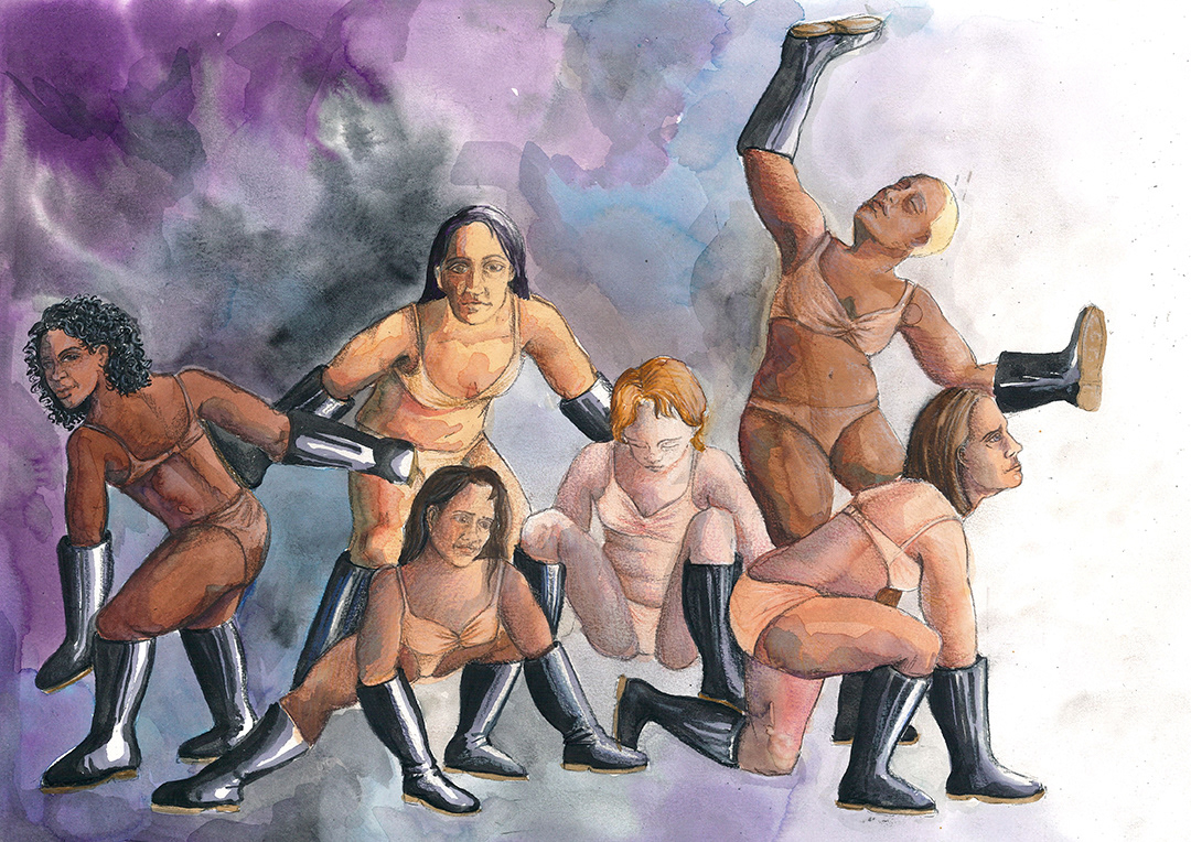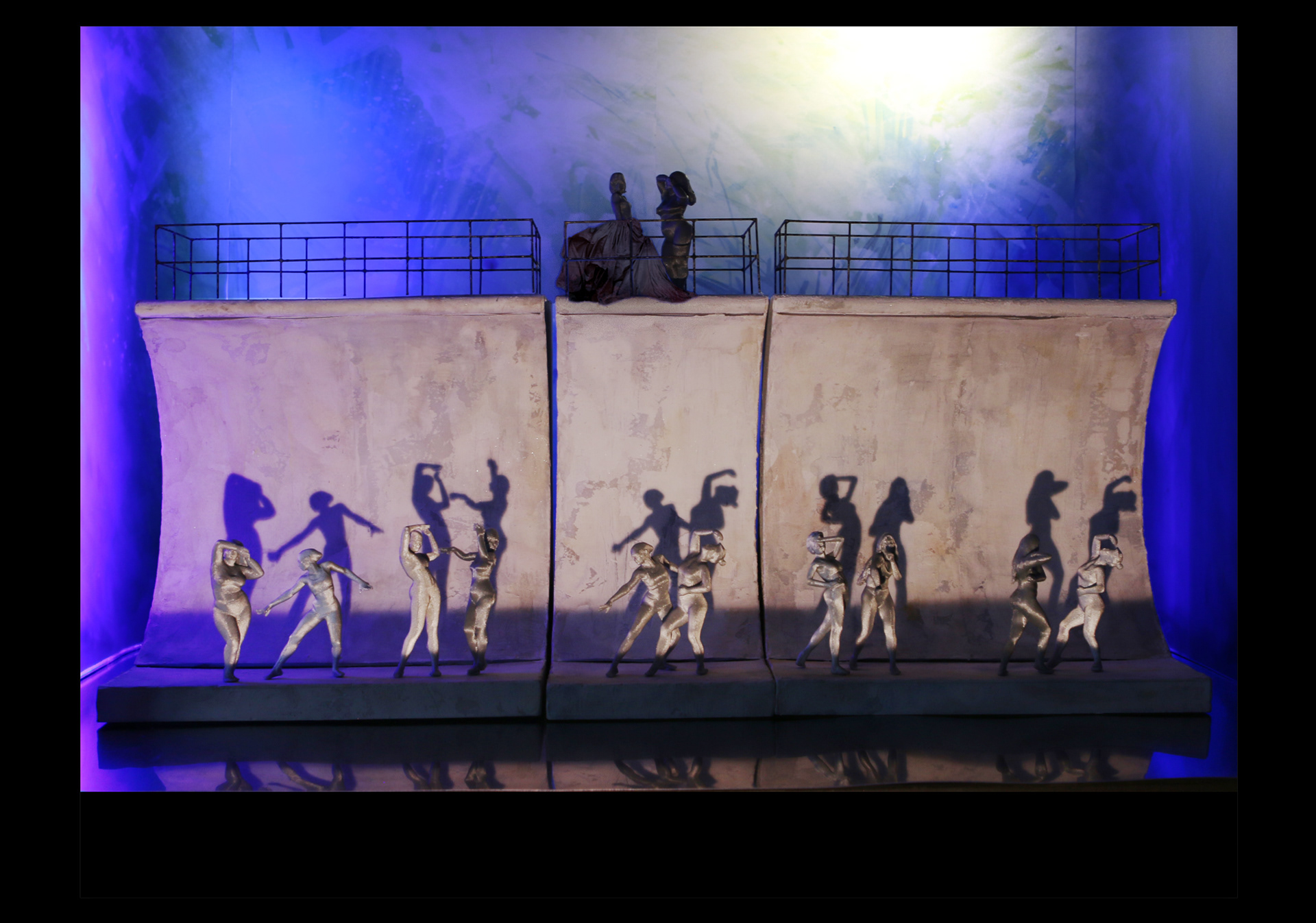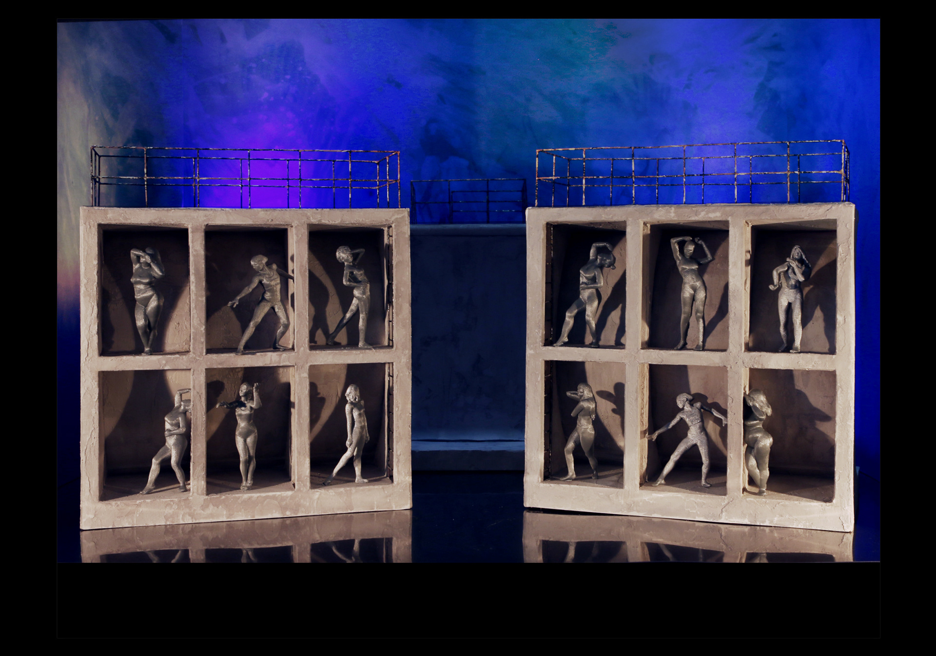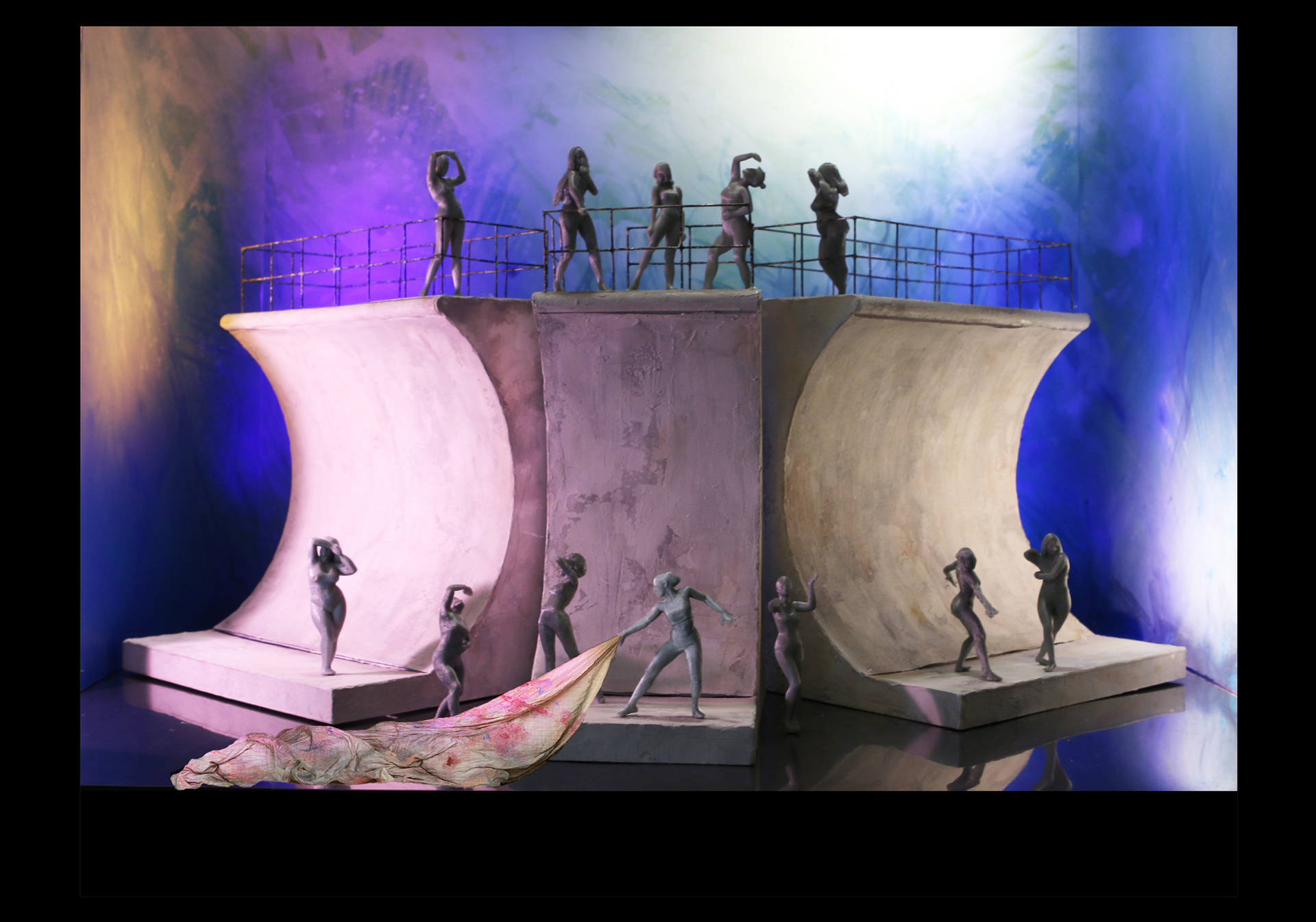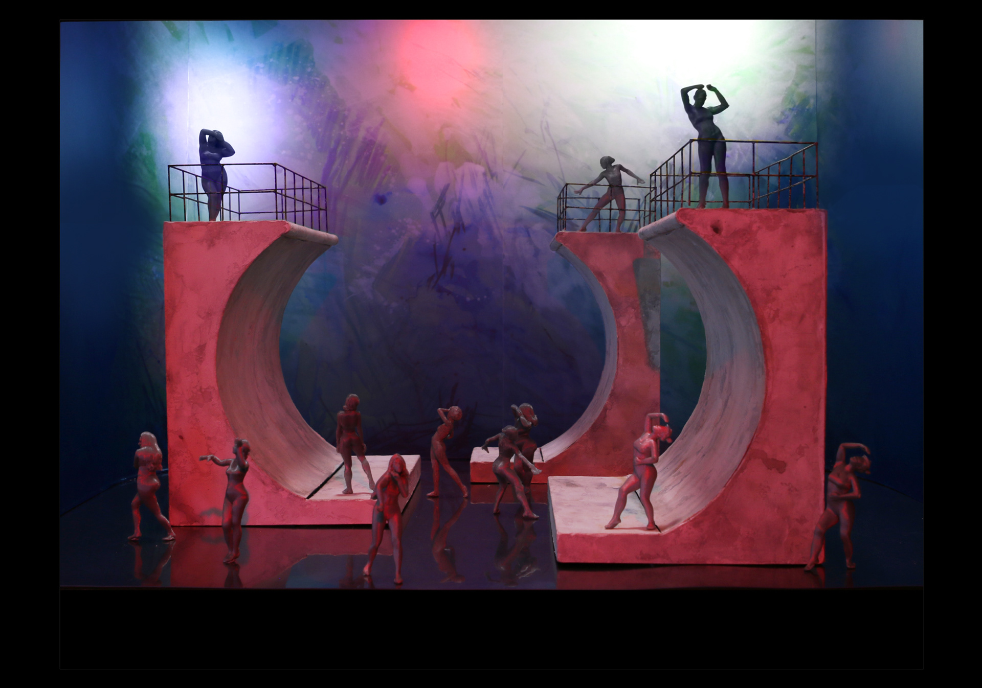 Each of the scenes, based on five of Rego’s pictures, has been devised to tell a story of conformity and transgression, particularly as it relates to the performance of gender. Referencing Rego’s upbringing on the Iberian Peninsula, the piece is set in an ambiguous coastal location, where large sea walls demarcate the space. As these objects move throughout the piece, so do the spatial rules, which are continually broken and reconfigured.